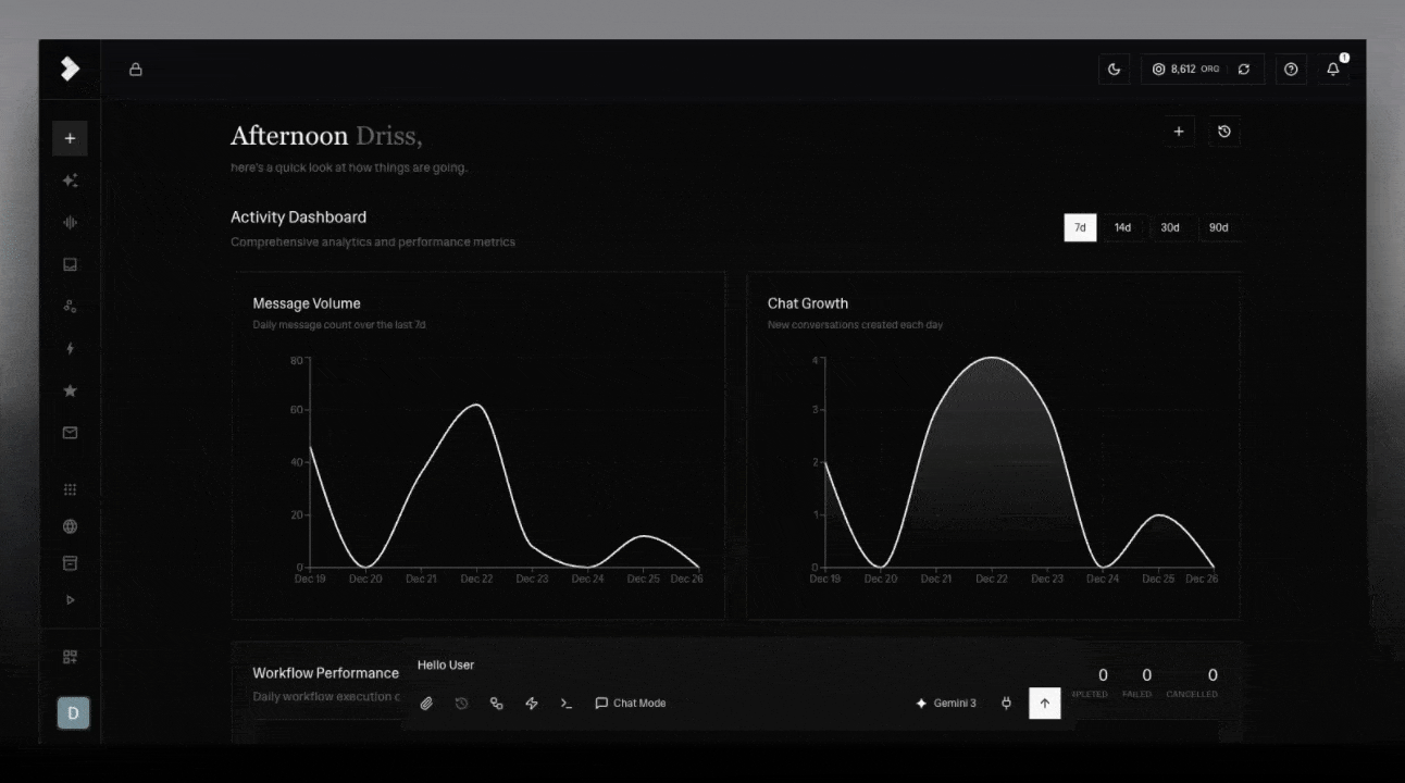 Ask your AI assistant anything - execute workflows, search your knowledge base, connect to apps, and get intelligent insights. Understand your automation patterns and optimize for efficiency.